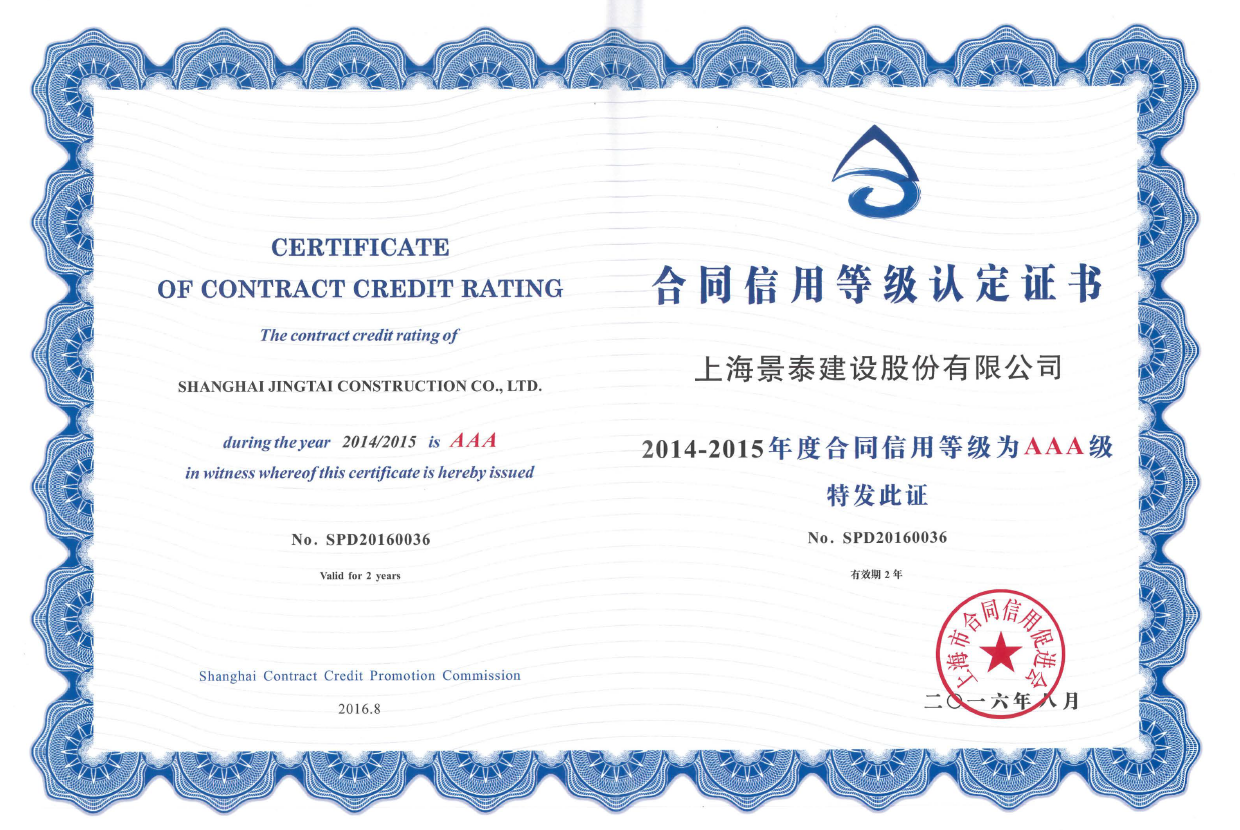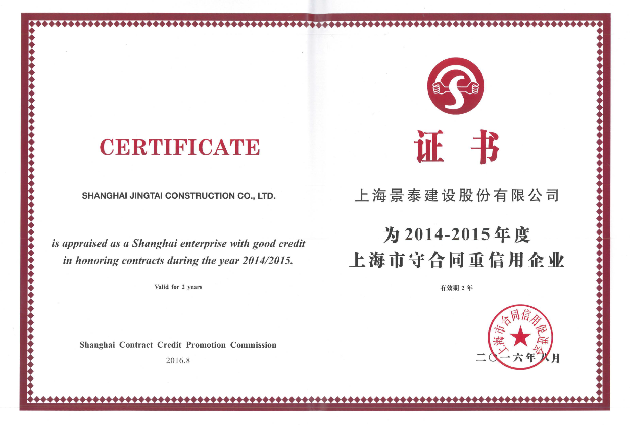 • A Shanghai Enterprise with Good Credit in Honoring Contracts During The Year 2014/2015
